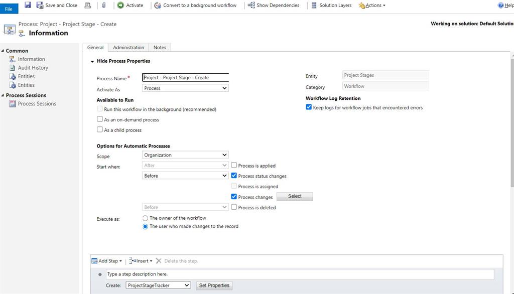 7.Create an OOB realtime Workflow on BPF Entity Project Stages, as shown below: