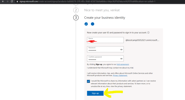 10)Once click on next, now create user Id and password to sign in to your account as shown below and select check box and click on Signup button