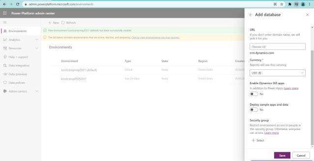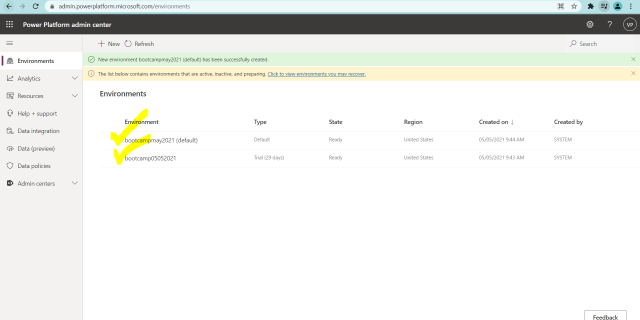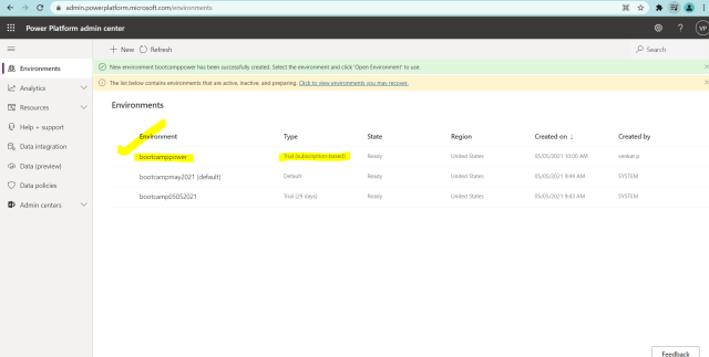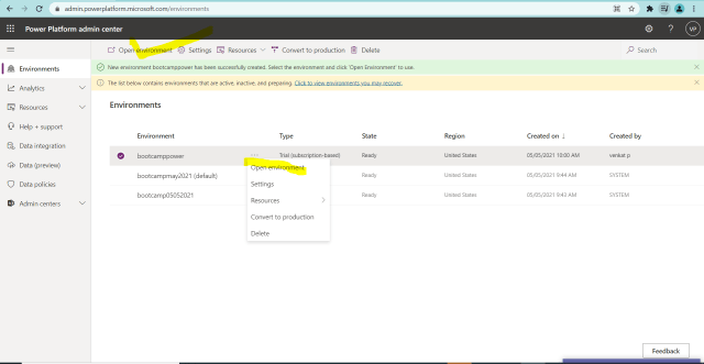 18)Select the above newly created environment bootcamppower and select either open environment at the top or select … and select open environment as shown in below figure.
