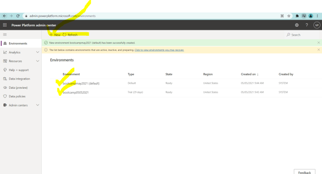 13)We will be navigated to https://admin.powerplatform.microsoft.com/environments and you could see few default environments will be created as shown below.