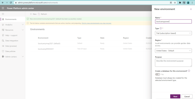 15)Once click on + button, quick view at the right side will be opened with New Environment provide name, Type as Trial[Subscription-based]and Region and click on next