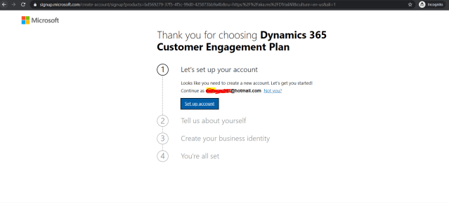 4) After Step 3 ,Once you click on Click here a new window as show in below diagram and provide personal email address in step 1 under let’s set up your account and click on next.