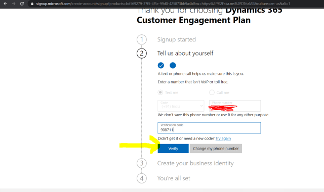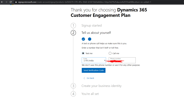 7)Once you click on next, under step 2 tell us about yourself provide your mobile number and select either text or call me option, here I chose text me option and click on Send Verification code button as shown below.