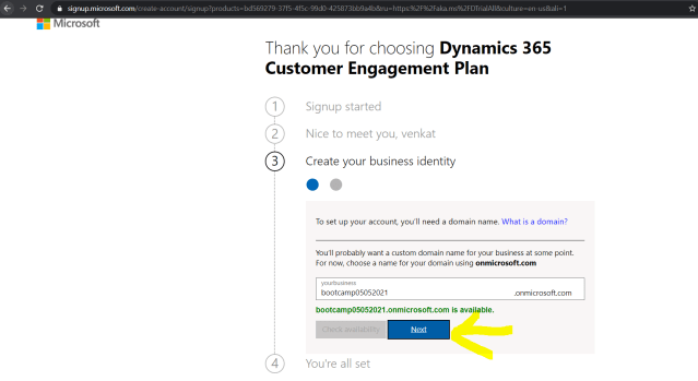 9)After successful verification navigation will go to next point 3 Create your business identity and provide name and see for availability, if domain is available then next button will be highlighted as shown below.