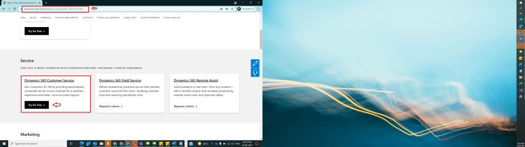1)Go to https://trials.dynamics.com/ it will redirect to https://dynamics.microsoft.com/en-us/dynamics-365-free-trial/, and select whatever the modules that are required to explore, here I have selected Dynamics 365 Customer Service and clicked on Try for New as shown below.