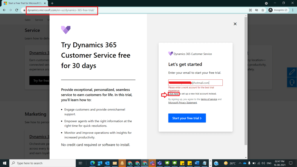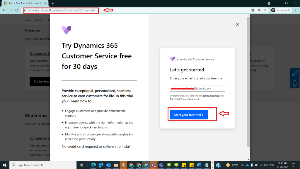 2)It will be navigated to another window with Try Dynamics 365 Customer Service free for 30 Days and provide an email id and click on Start your free trail as shown below