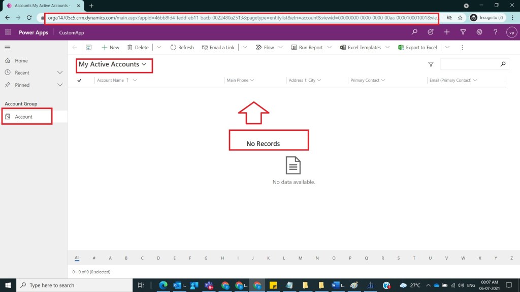After Step 5, Before selection of Data file, open CRM Environment from browser and confirm that no records under Account entity as shown below.