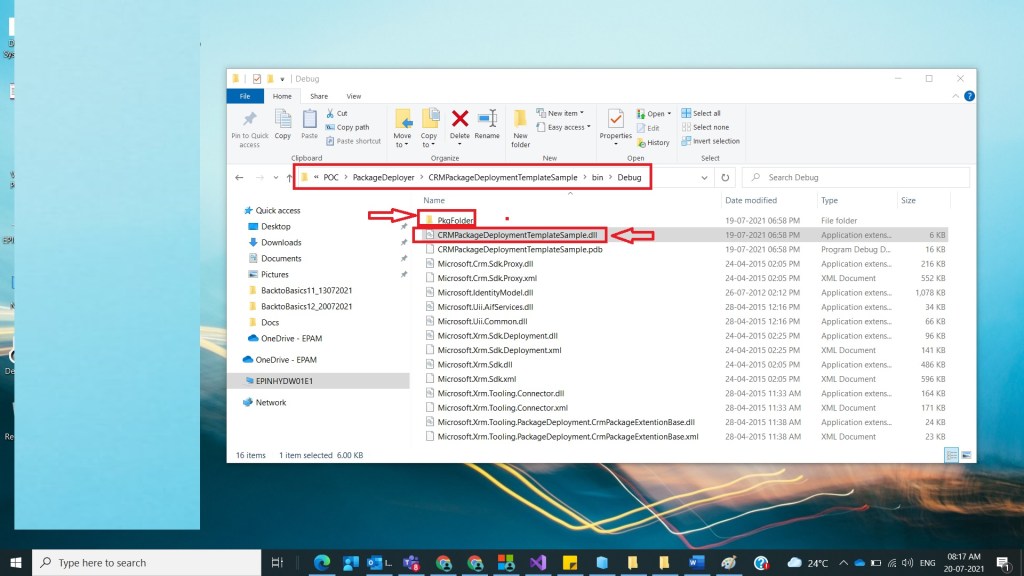 After Step 9, all Nuget packages get re-aligned to CRM Related Dll’s and then a dll file with name CRMPackageDeploymentTemplateSample.dll gets generated and folder PkgFolder also gets generated under Debug/Release Folder -> Bin Folder , here as an example I considered Debug folder as shown in the below figure.