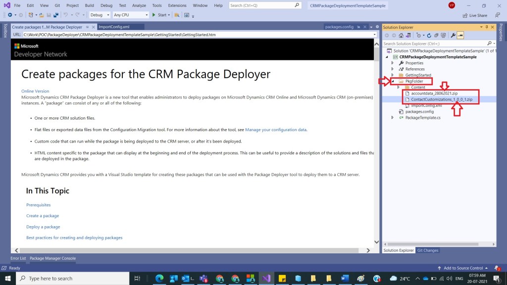 After Step 6 , add your CRM customizations Solution exported Zip files and data files into PkgFolder only as an example I will be adding 1 CRM Customizations Solution zip type file with name ContactCustomizations_1_0_0_1 and a data zip type file with name accountdata_28062021 and save it as shown in the below figure.
