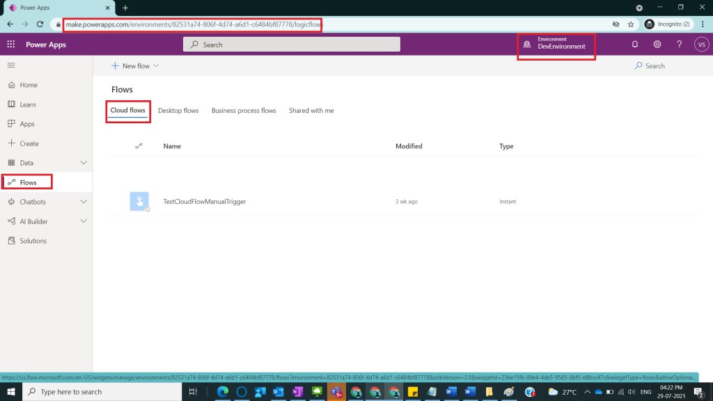 Login to the required Power Apps environment using URL make.powerapps.com by providing user name and password and click on Flows on the left hand side as shown in the below figure.