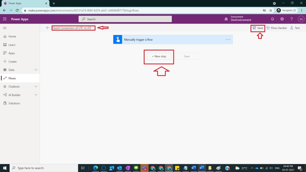 After Step 3, a new screen will be displayed and provide the name Quick Conversion of UTC to IST and click on Save button and click on New Step as shown in the below figure.
