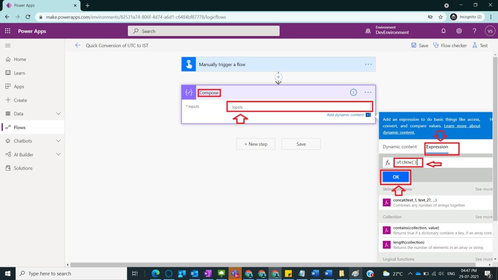 where the function covertFromUtc have 2 parameters in the first parameter provided current UTC Time and the 2nd parameter provided the string ‘India Standard Time’ that is required for final result time zone and click on OK as shown in the below figure. To remove confusion renamed compose action present in Step 6 to UTC Time and click on Save.