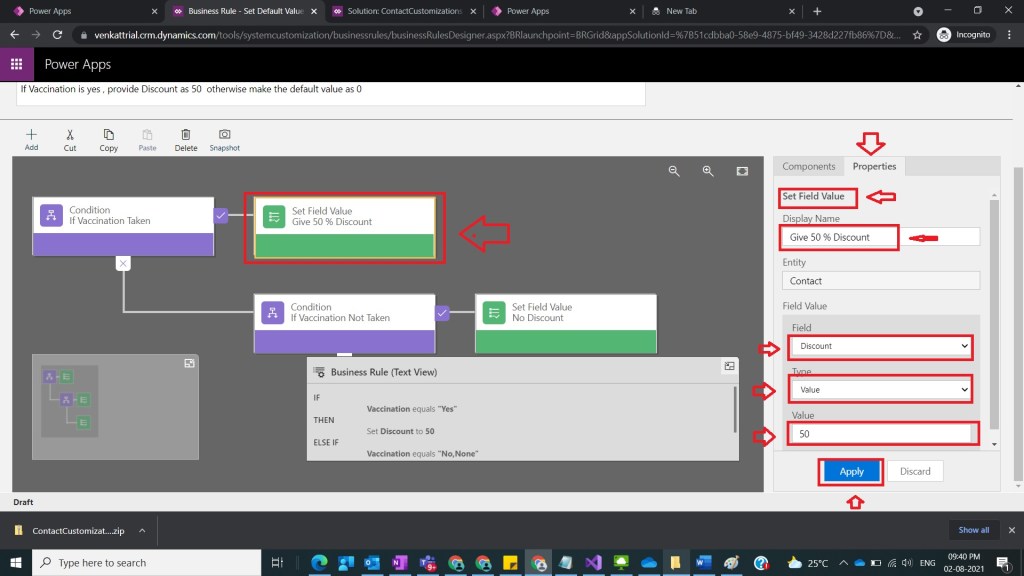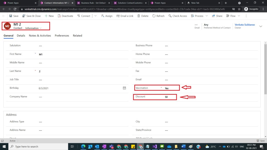 After Step 8, let us test this Business rule open any contact record and verify if vaccination is Yes then discount is shown as 50 shown in the below figure.