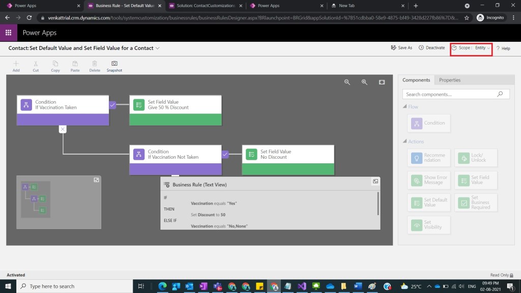 In Dynamics 365 CRM or Power Platform, Business rules provide a quick way of applying business conditions every business rule starts with a condition. In this article we are going to see about 2 Actions Set Default Value and Set Field Value with a business scenario on contact entity if Vaccination is done, then a discount of 50% is given to contact else no discount.