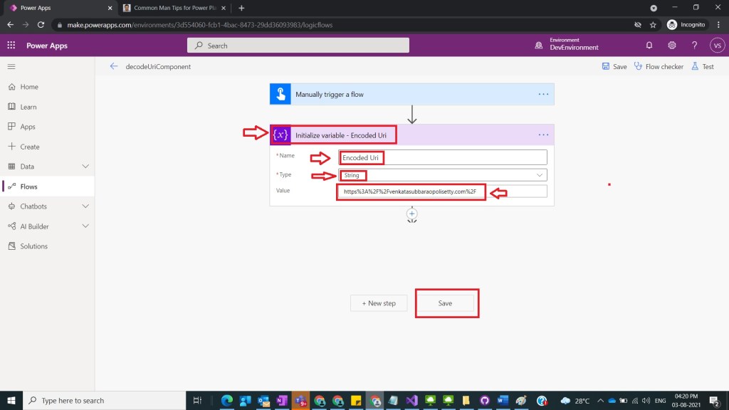 After Step 3, give title as Initialize variable – Encoded Uri and provide