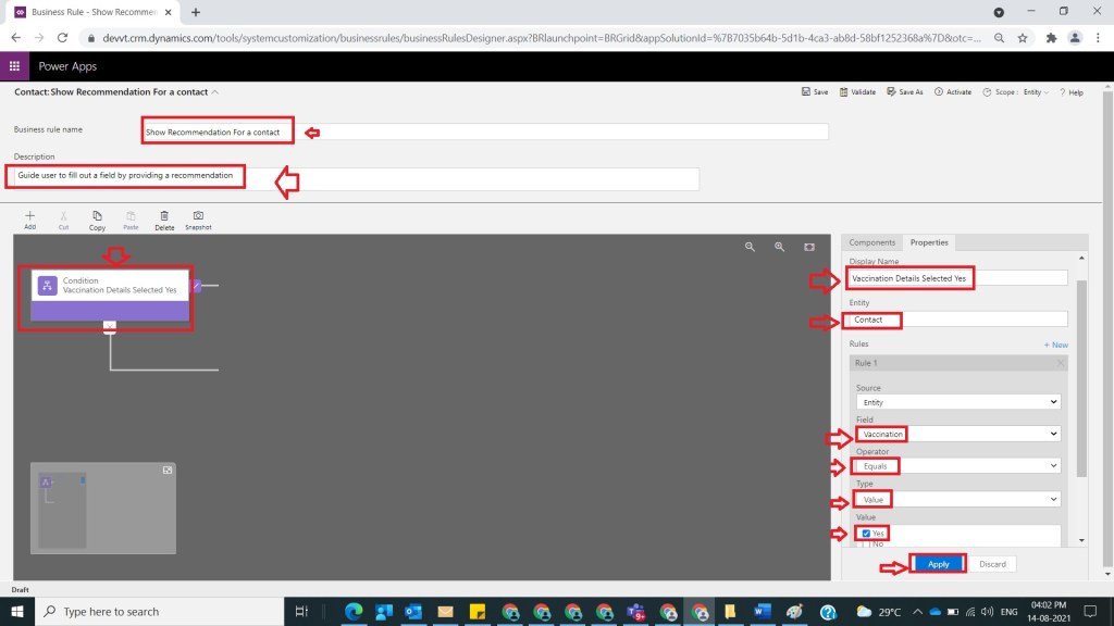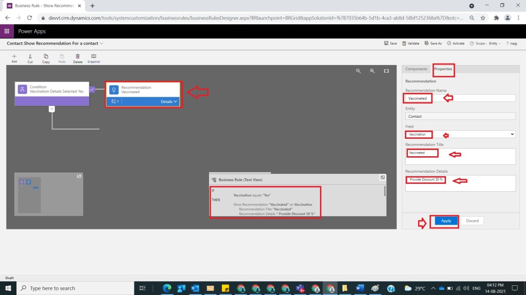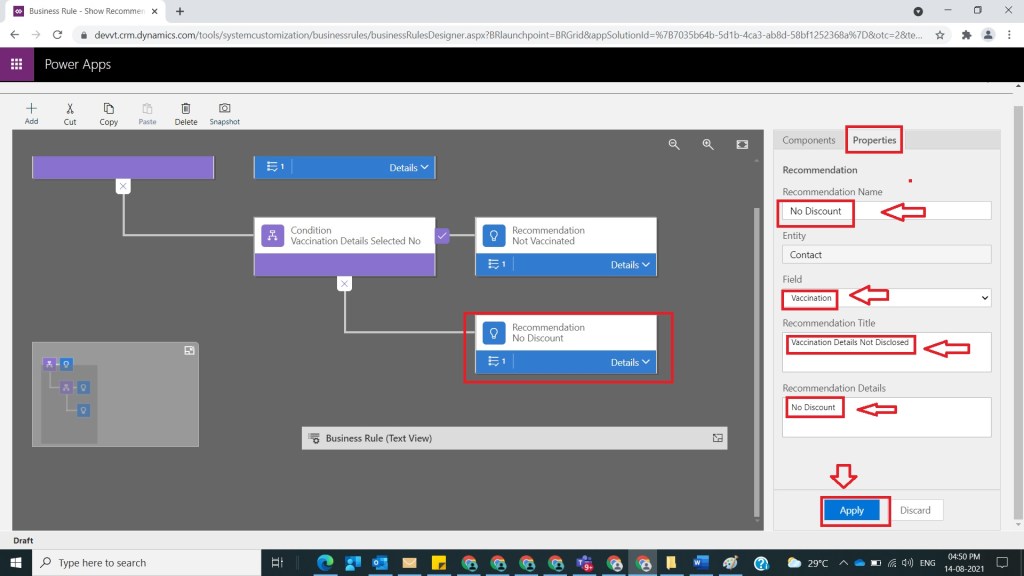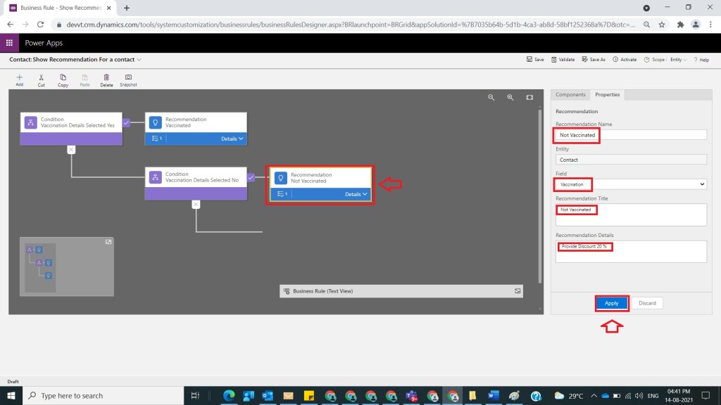 After Step 7, now drag and drop Recommendation and provide relevant name as Not Vaccinated and select Field Vaccination and Title as Not Vaccinated and Recommendation Details with Provide Discount 20 % and click on Apply as shown in the below figure.