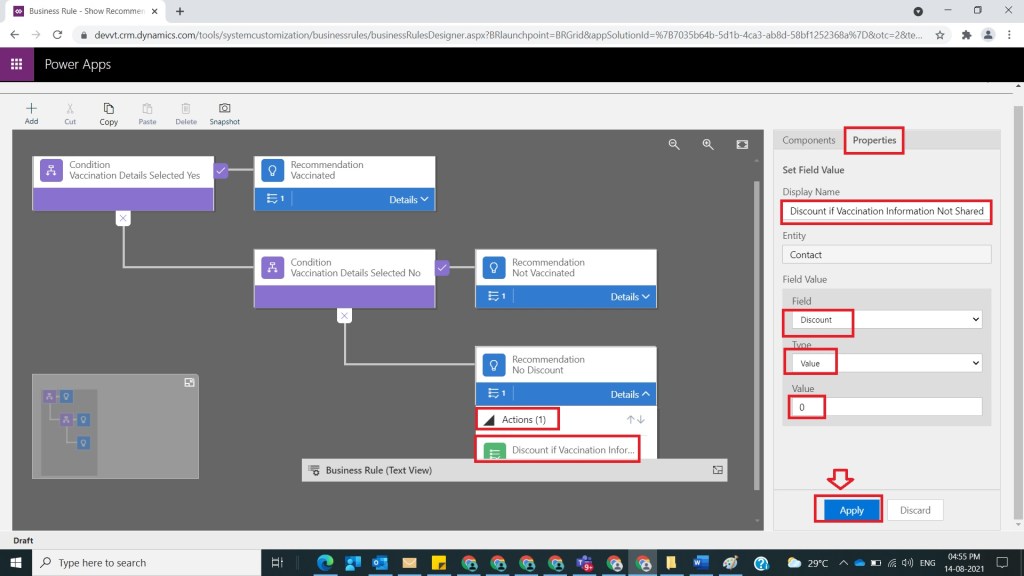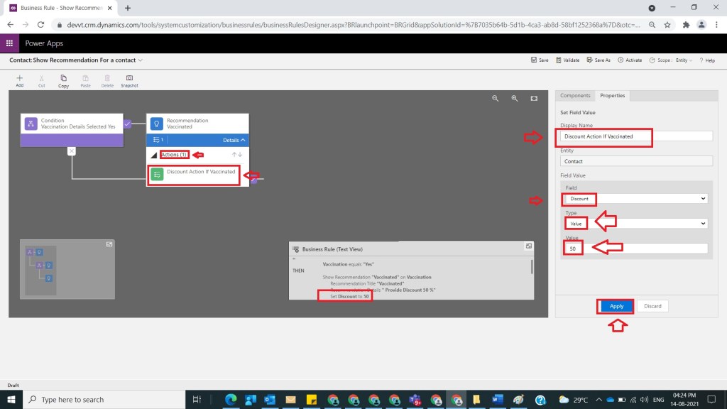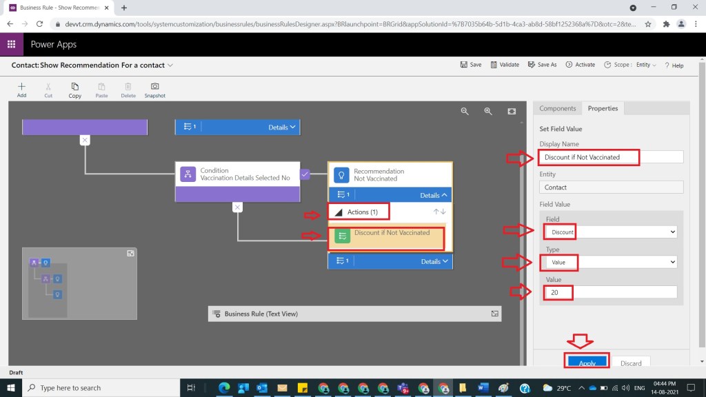 After Step 8, select Actions under Not Vaccinated Recommendation and provide action name as Discount id Not Vaccinated and under Field Value section select field Discount and provide value as 20 and click on Apply as shown in the below figure.
