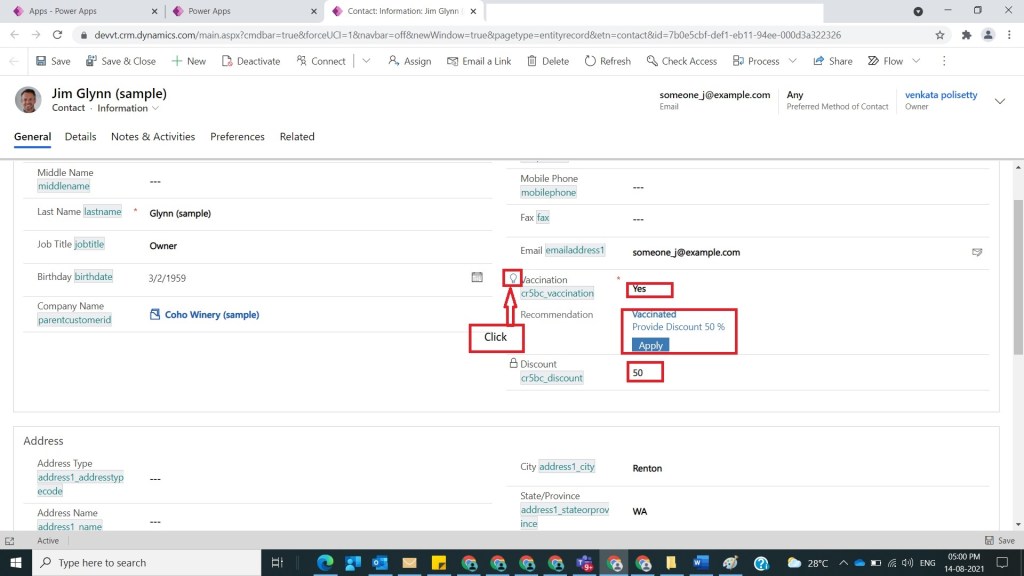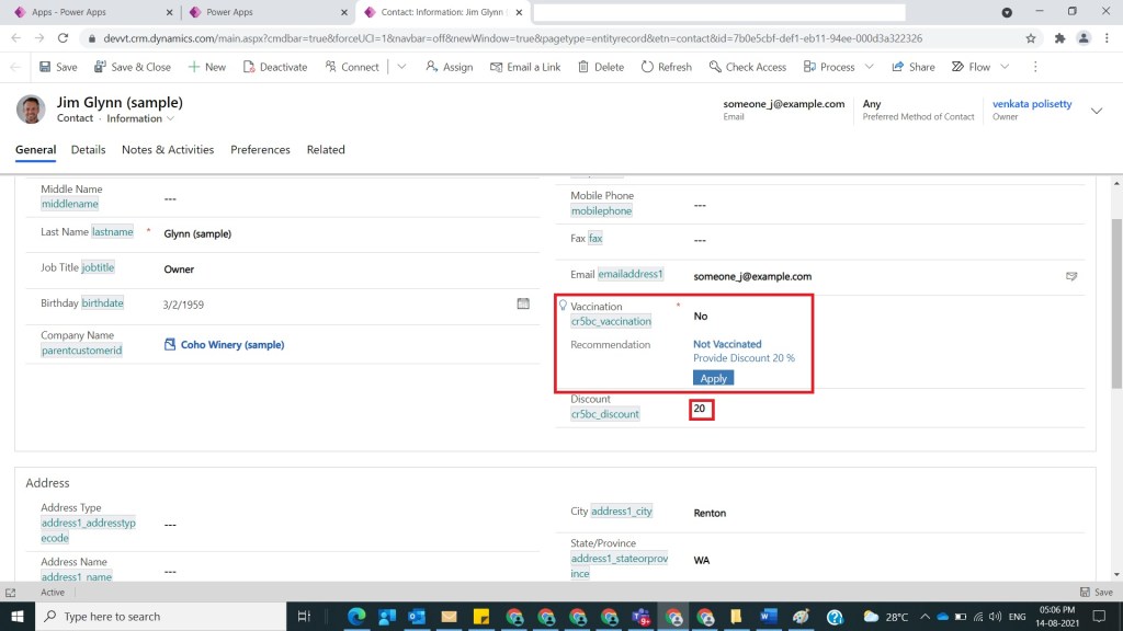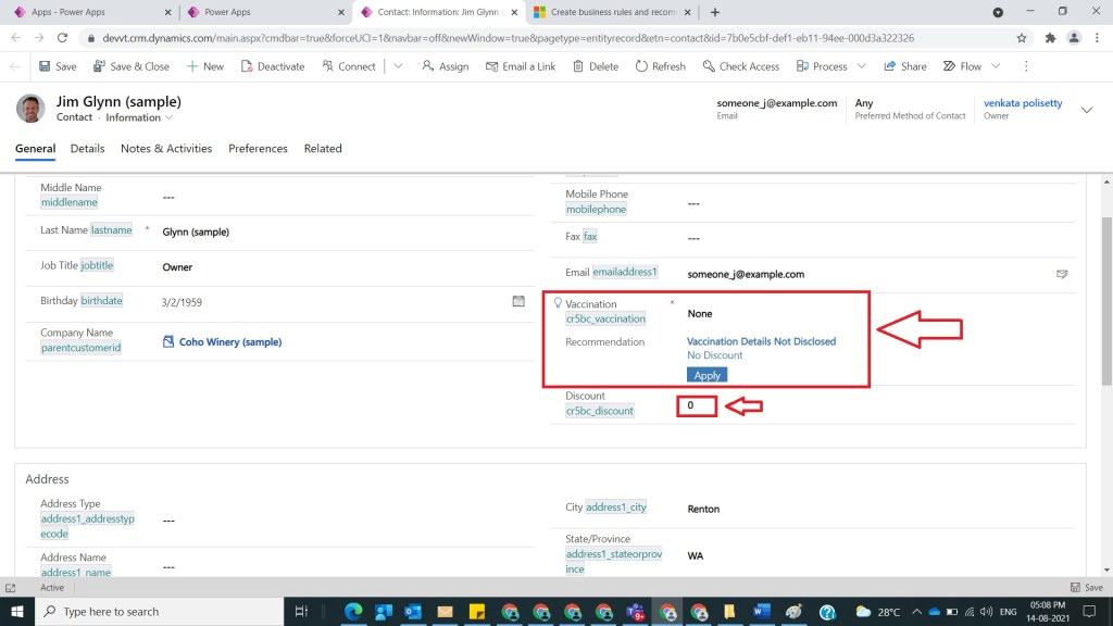 After Step 11, save and activate business rule and publish Contact Customization’s solution as specified in Step 3 and then open any contact record and see if Vaccination is selected as Yes and Recommendation title and description will be shown and Apply button if click on it then Discount will be shown as 50 as shown in the below figure.