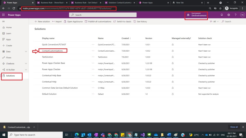After Step 1, select custom solution here select ContactCustomizations custom solution as shown in the below figure.