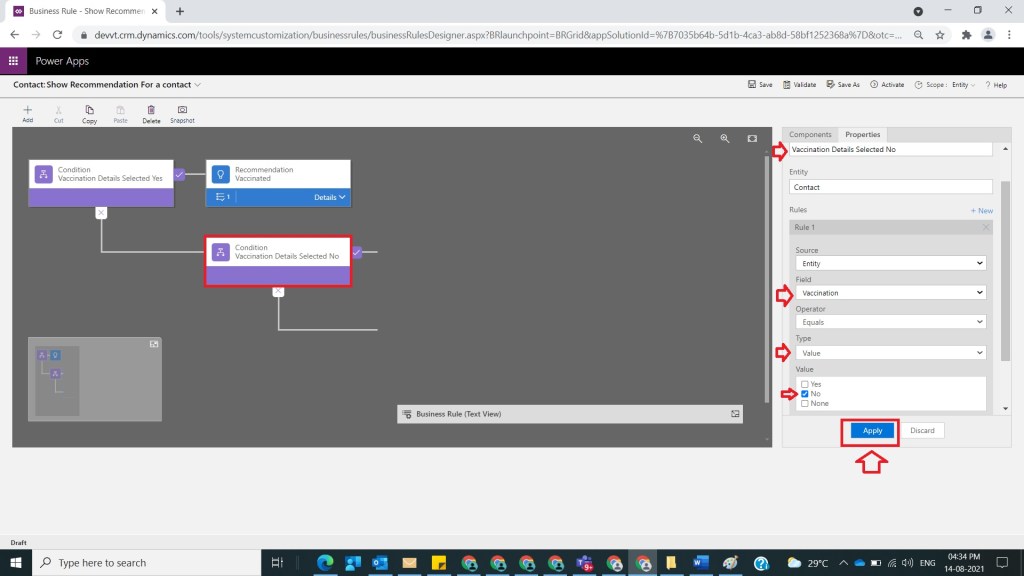 After Step 6, in the else part of Condition Vaccination Details Selected Yes drag and drop another Condition and provide name as Vaccination Details Selected No and provide rule as Vaccination value as No and click on Apply as shown in the below figure.