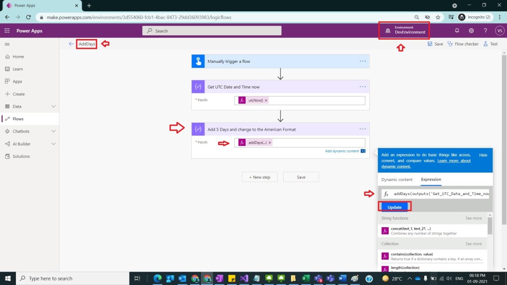addDays(outputs(‘Get_UTC_Date_and_Time_now’),5,’MM-dd-yyyy’)