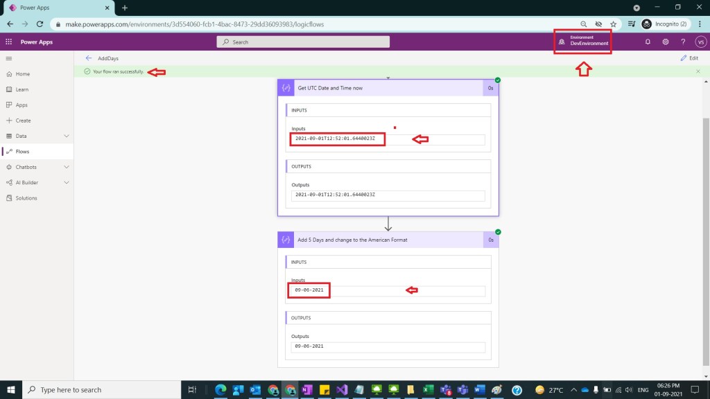 After Step 4, Test and run the flow and see the desired result that 5 days are added to the current utc date time now as shown in the below figure.