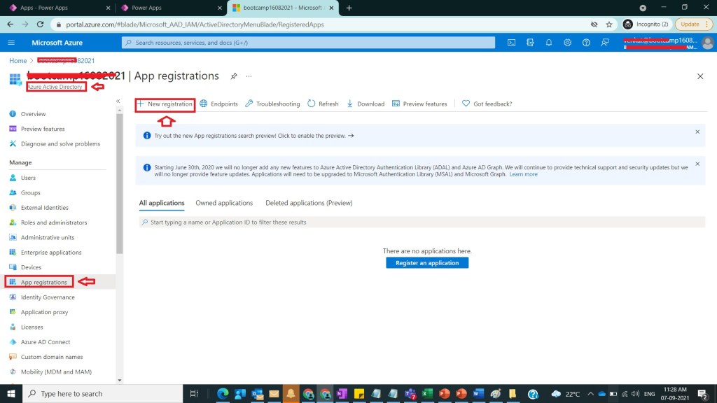 After Step 3, in Azure Active Directory under Manage section select App Registrations and click on New Registration as shown in the below figure.