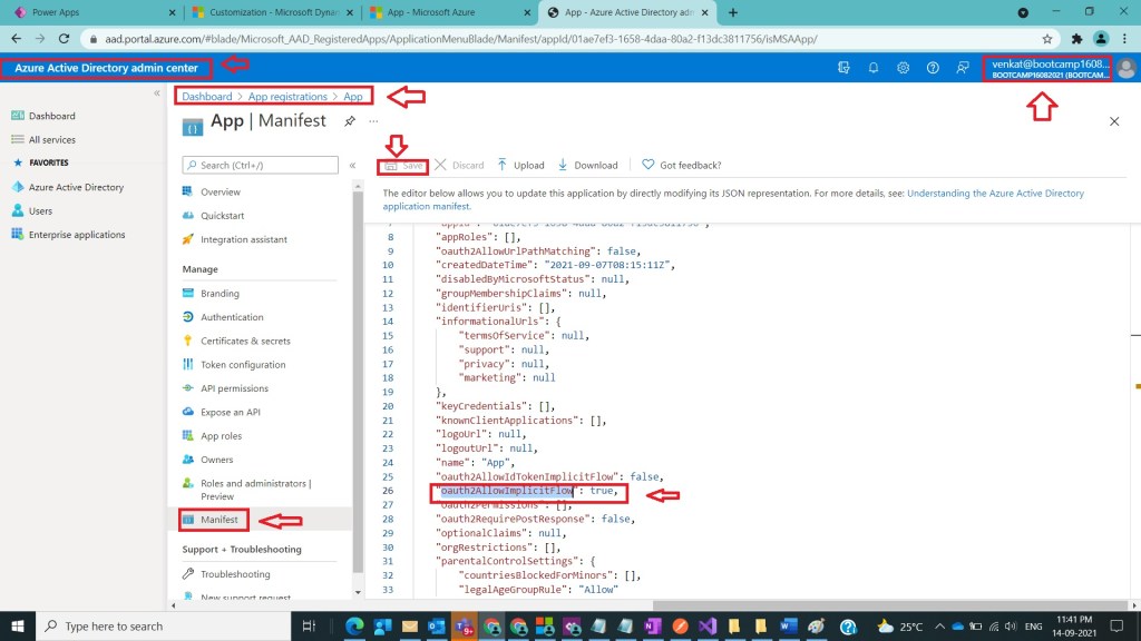 - In case if 401 un authorized error occurs, then open app in Azure portal and navigate to Manifest and provide oauth2AllowImplicitFlow as true as shown in the below figure.