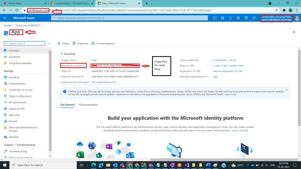 After Step 3, we must navigate to Azure portal through portal.azure.com using Dynamics CRM Environment and open Azure Active Directory then Applications , select created application and copy application /client id for the app which we registered in previous post as shown in the below figure.
