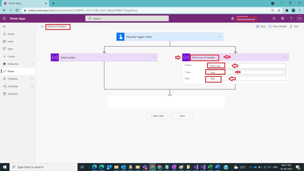 After Step 2, Add a parallel branch and in one part name flow as Division Function and take initialize variable action and provide step name it as Total Candies and then provide the inputs as in one side