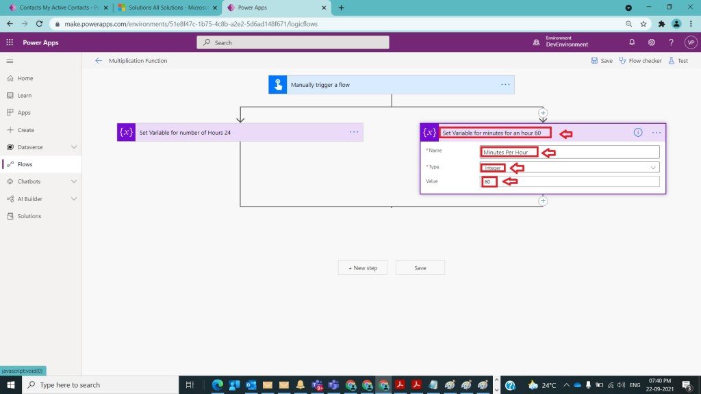 After Step 2, Add a parallel branch and in one part name flow as Multiplication Function and take initialize variable action and provide step name it as Set Variable for number of Hours 24 and then provide the inputs as in one side