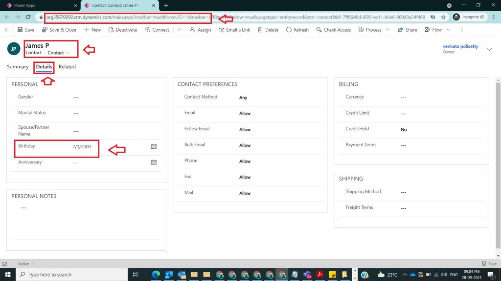 After Step 6, open CRM contact record and observe birthdate field populated with provided value as shown in the below figure.