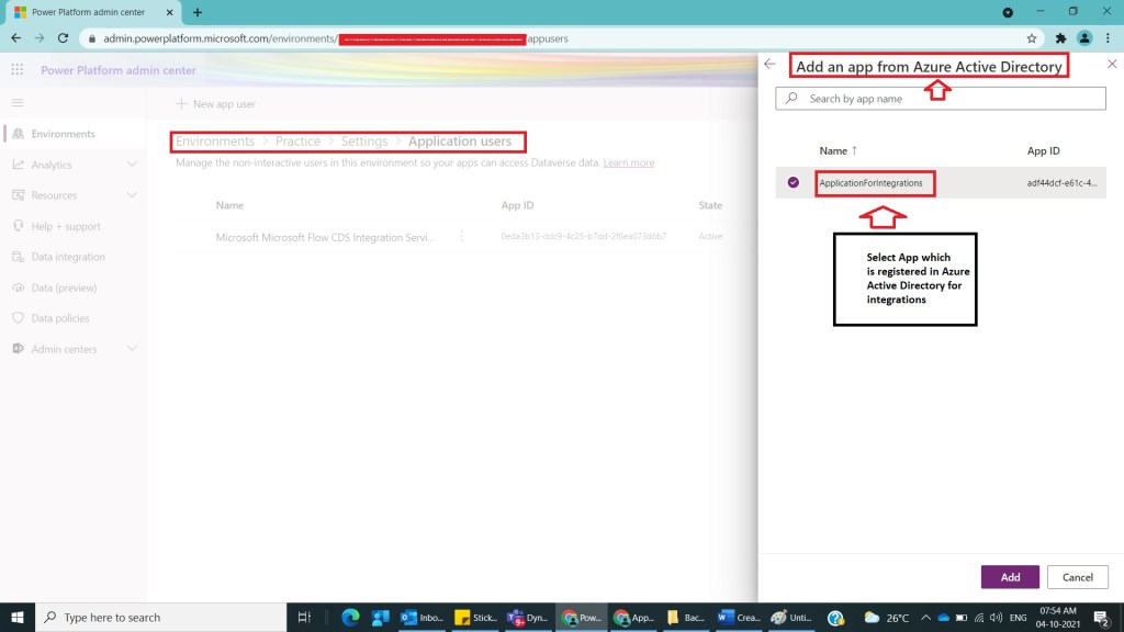 In Dynamics / Power Platform integrations plays an important role for extending Dynamics/Power platform to integrate with legacy systems or other applications. Post creation of an application in Azure Active directory, next application user must be created so that this user can be used to connect to Dynamics CRM from other applications. In this post we see how to create an application user using Power Platform Admin center.