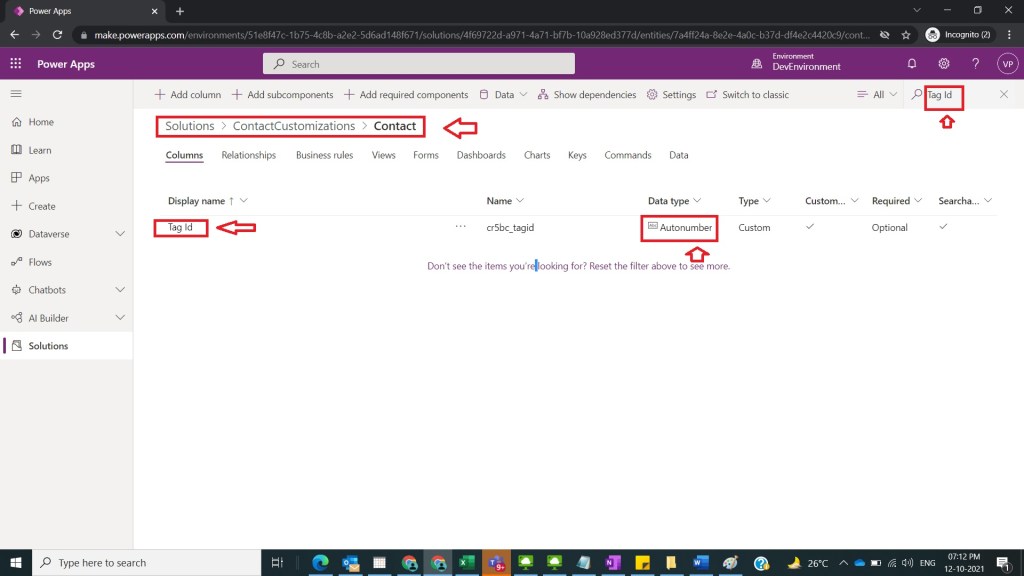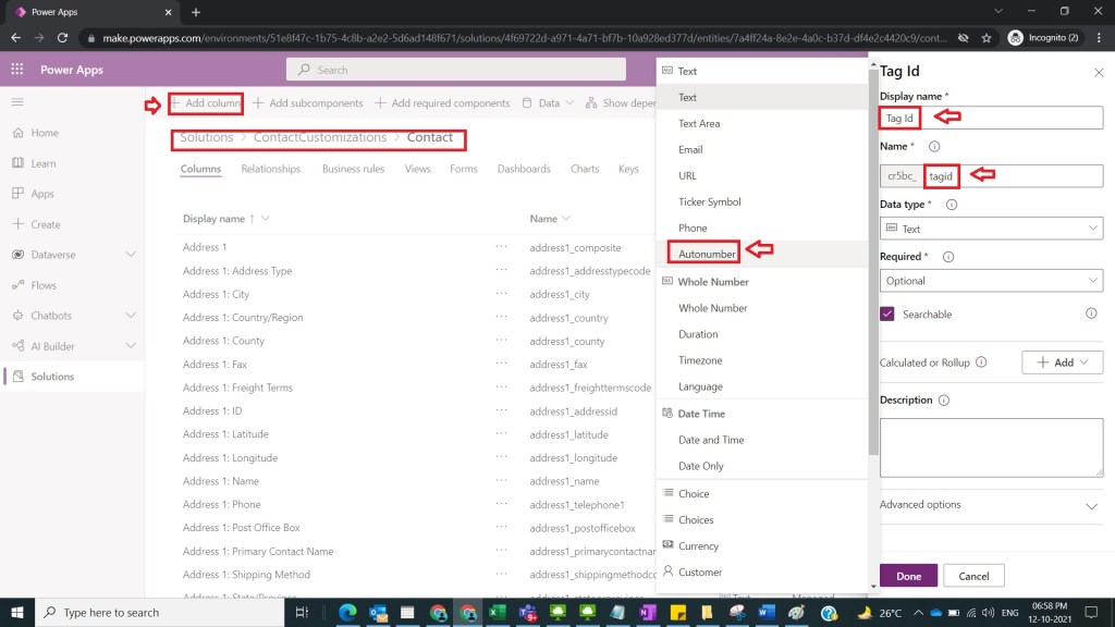 After Step 1, select solution and navigate to contact entity and then click on add column and provide Display name as Tag Id and Name as tagid and under datatype select Autonumber type as shown in the below figure