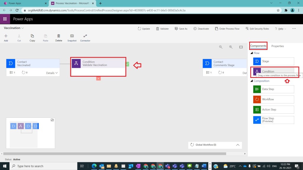 After Step1, click on Vaccination flow and click on edit and go to components and select Condition Component and drag and drop it to Business Process Flow Designer and name it as Validate Vaccination as shown in the below figure.