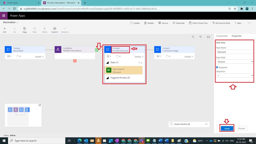 After Step 6, navigate to dynamics crm instance and then open contact record and then select vaccination completed to yes and observe BPF Stage Discount showed as shown in the below figure.