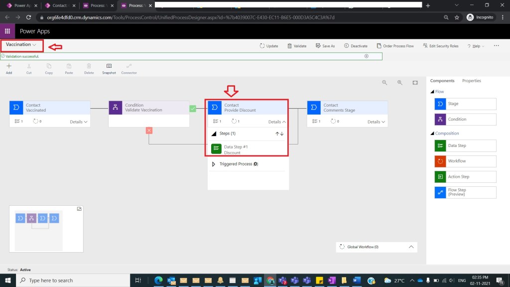After Step 1, click on Vaccination Business process flow and click on edit and go to components and select existing stage Provide Discount as shown in the below figure.