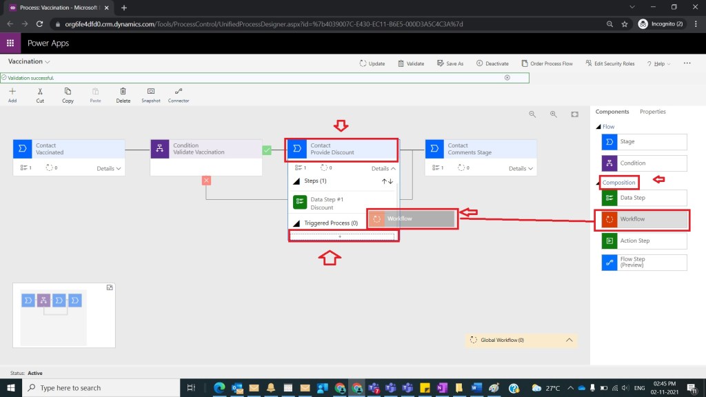 After Step 2, on Provide Discount Stage select components in the right and select Workflow under Composition section and drag and drop under triggered Process as shown in the below figure.