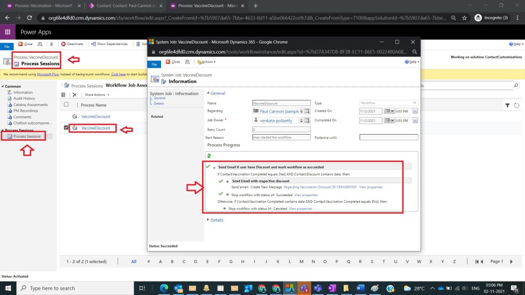 After Step 6, now as a quick test navigate to Vaccine Discount Workflow process and under Process Sessions select recent execution and an email be sent to selected contact as shown in the below figure.