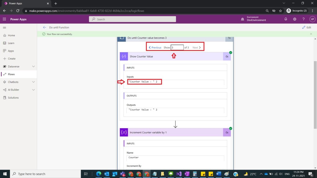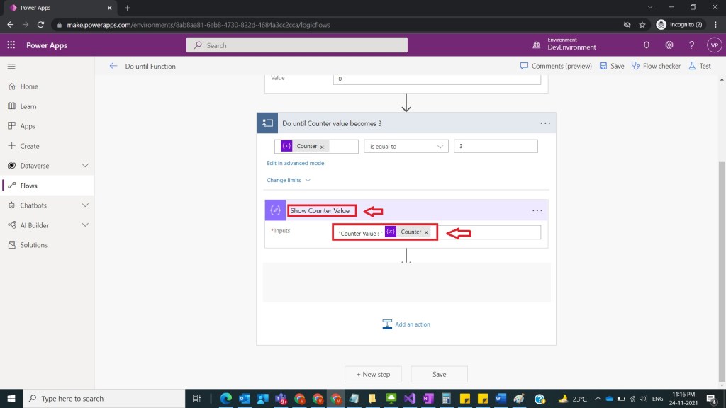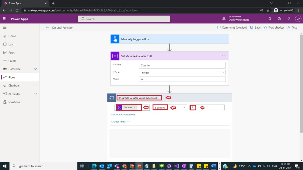 In Power Automate, at times we must repeat certain steps until a condition met. In these scenarios we make use of Do until function as an example counter value will be incremented till it become 3.