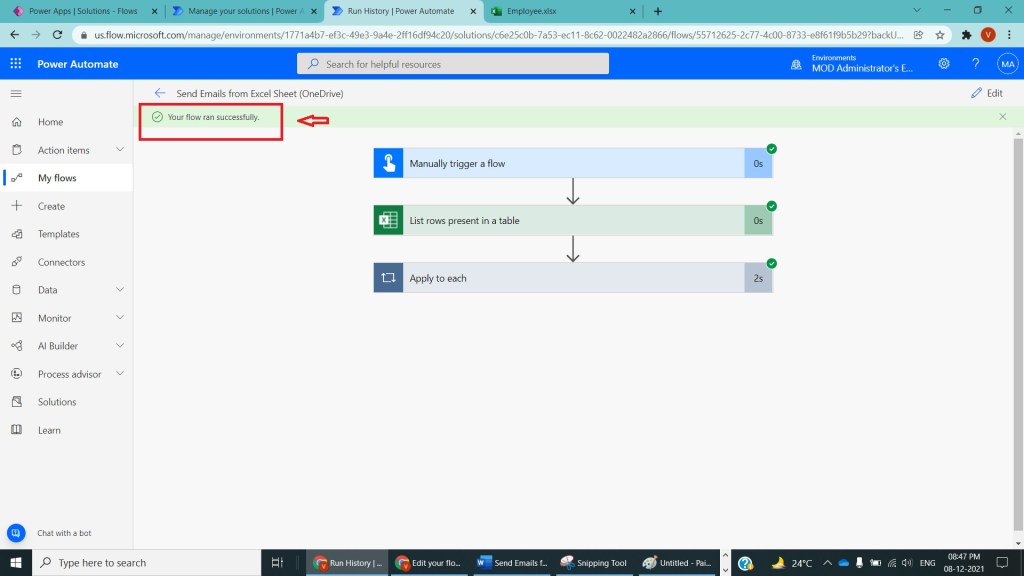 After Step 8, save the flow and test and run by providing required authentication for gmail and observe if there are no errors flow will run successfully as shown in the below figure