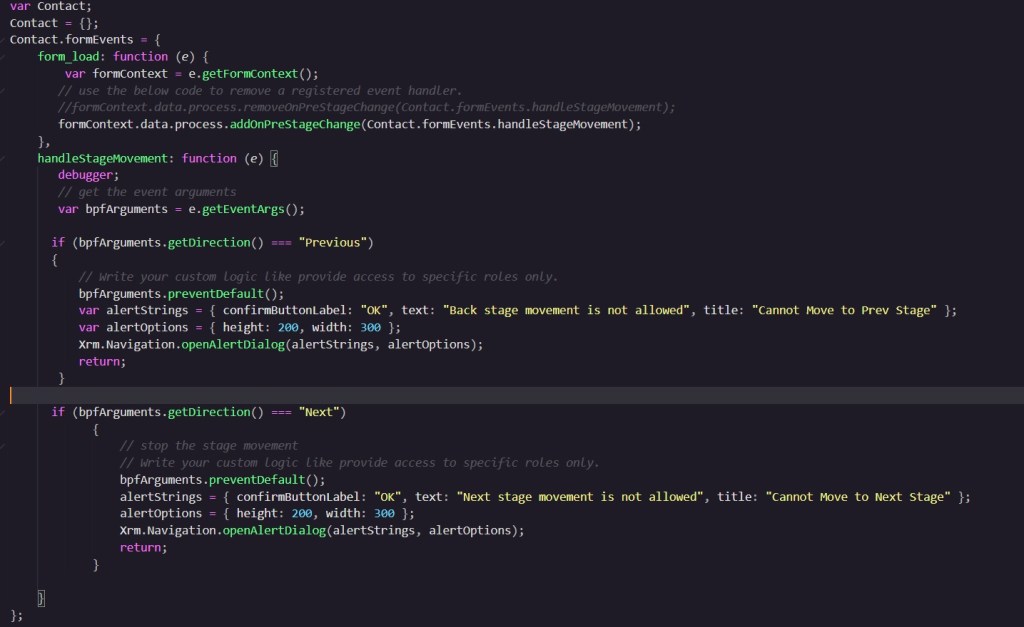 //formContext.data.process.removeOnPreStageChange(Contact.formEvents.handleStageMovement);