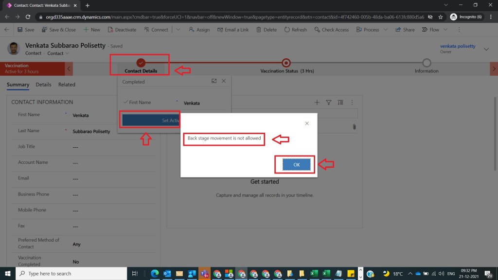 After Step 7, navigate back to contact entity and open contact record and try to manually try to change to next stage, user will encounter a popup as shown in the below figure