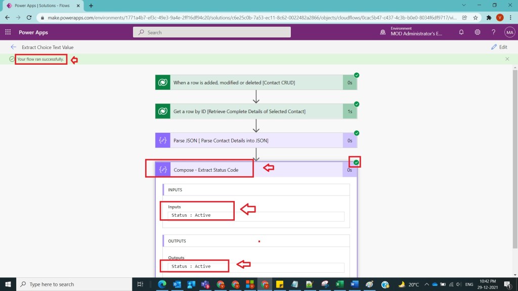 Inputs : Status : body(‘Parse_JSON_[_Parse_Contact_Details_into_JSON]’)?[‘statecode@OData.Community.Display.V1.FormattedValue’]