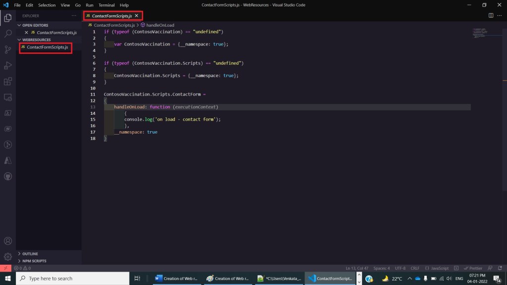 After Step 2, create a JavaScript file with name ContactFormScripts.js in visual studio code with the below code