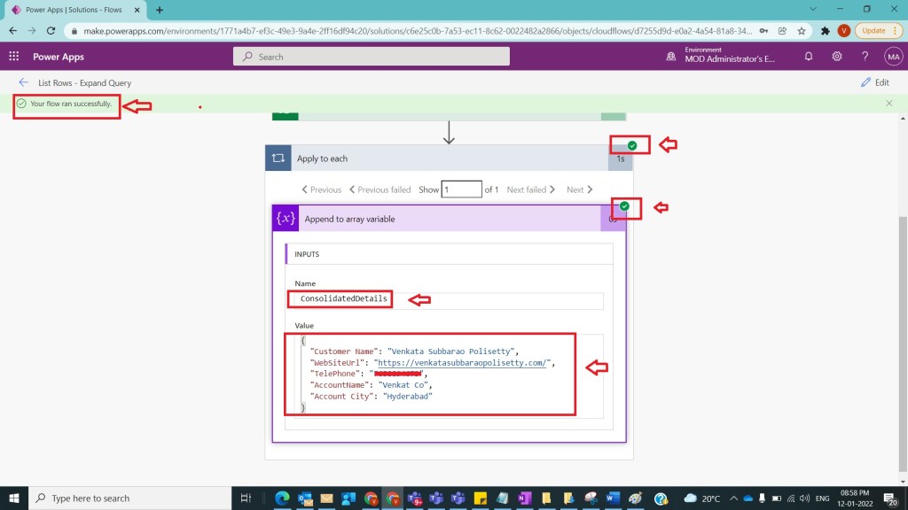 After Step 5, save, test, and run the flow and observe the details as shown in the below figure.
