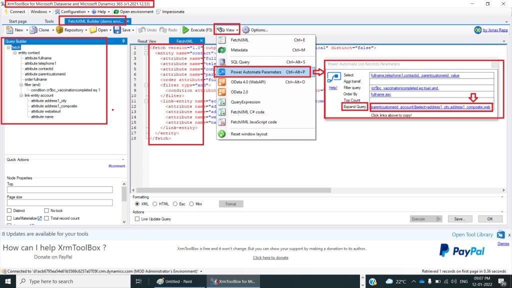 - One can easily form expand query by the use of XRM Tool Box ,Fetchxml Builder and form fetchxml with link-entity and then click on View -> Power Automate Parameters -> Power Automate List Records Parameters popup and under Expand Query click on the content link where query is there so that you can copy the query and go to Step 4 and provide Expand Query as shown in the below figure.