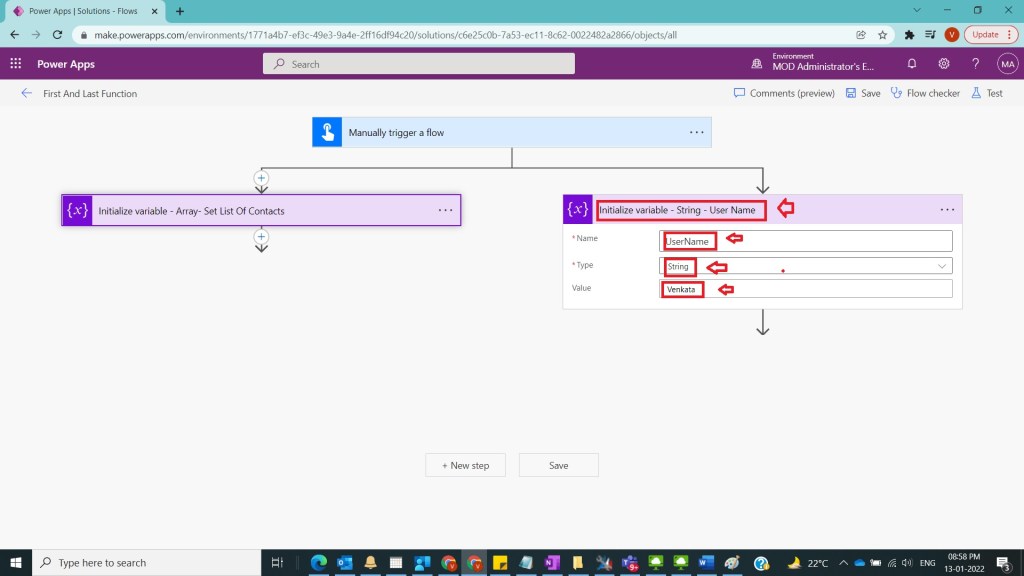 After Step 2, name the flow as First And Last Function and take a parallel branch and one side of branch take an initialize variable and name it as Initialize variable – Array- Set List Of Contacts and provide values