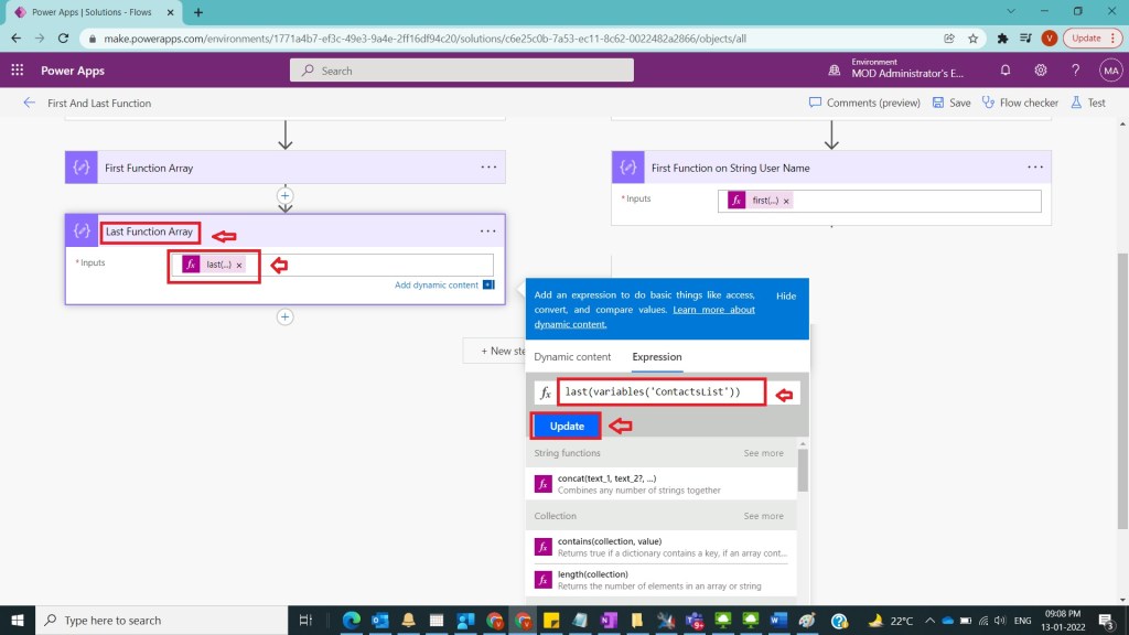 After Step 6, under First Function Array action take new action and name it as Last Function Array and provide inputs as