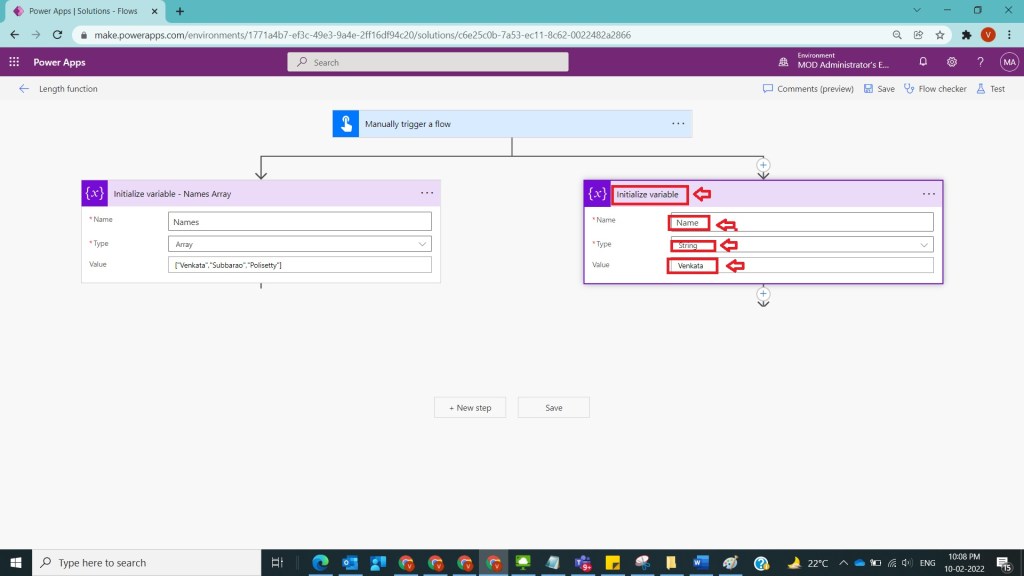 After Step 2, name the flow as Length Function and take a parallel branch and one side of branch take an initialize variable and name it as Initialize variable – Names Array and provide values